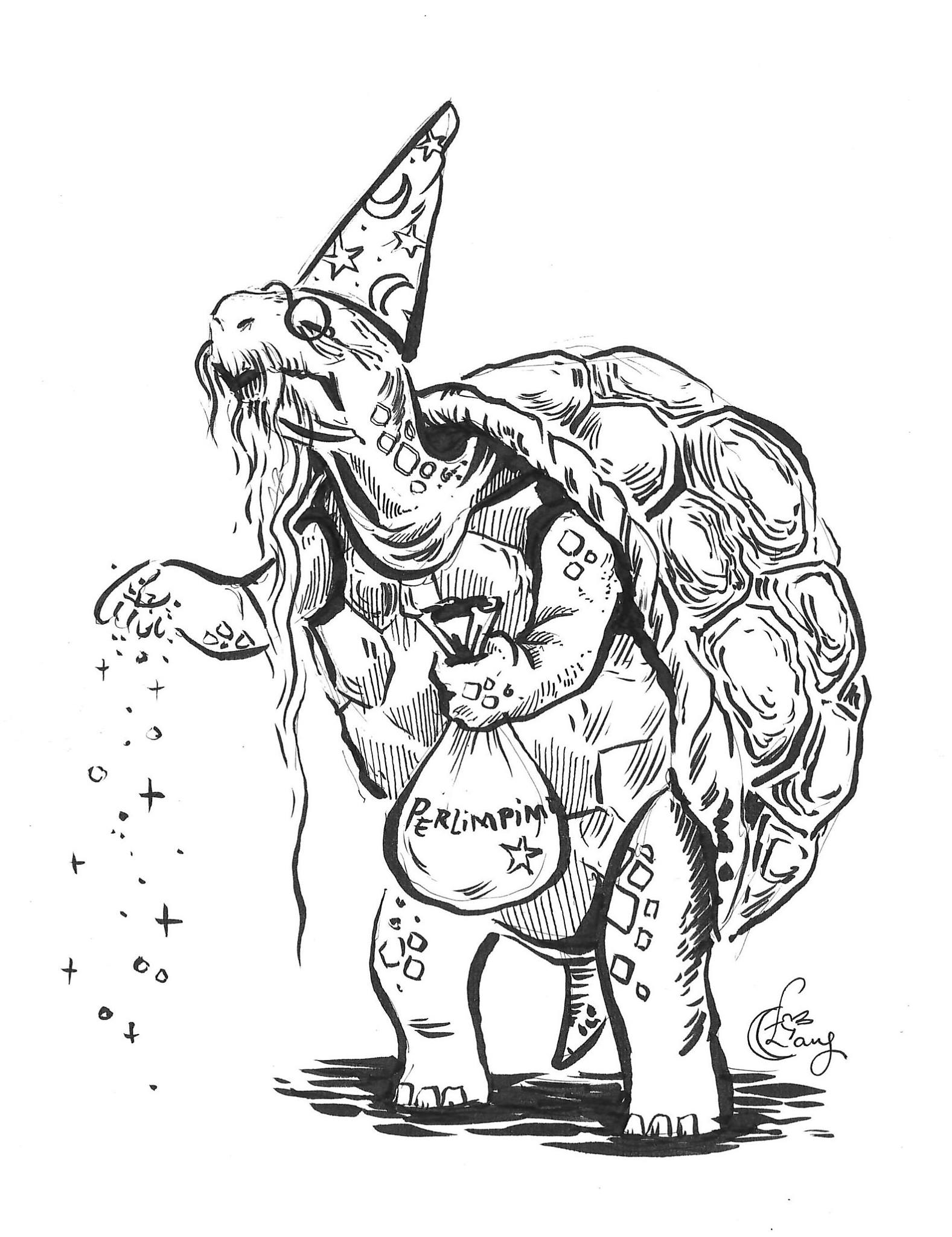 Un personnage tiré de la célèbre fable « Le lièvre et la tortue en cosplay de Merlin l’Enchanteur ». La page de Clang : https://www.facebook.com/Clang-dessins-et-peintures-dun-colibri-1425531864346028/