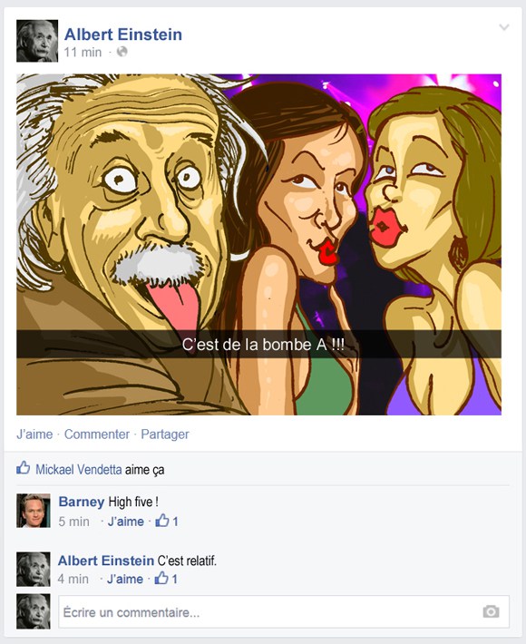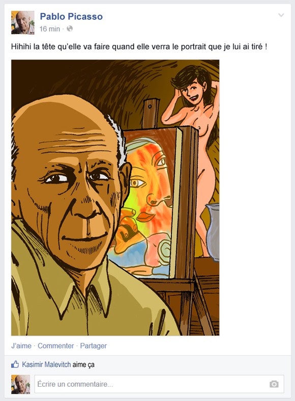 Pablo Picasso ne partageait ses selfies qu’avec un cercle restreint d’amis facebook, pour éviter que ses modèles ne tombent dessus. Il avait en effet pour sale habitude de s’en moquer honteusement dans leur dos en peignant n’importe comment, ce qui fut interprété comme un style artistique de génie. N’importe quoi.