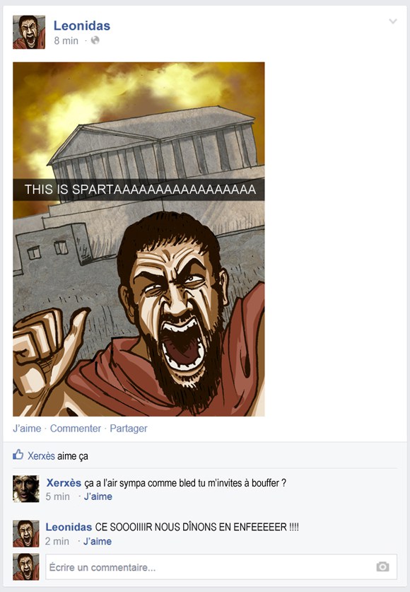 L’auteur de ce cliché dégoté à Athènes appréciait particulièrement partager son quotidien sur les réseaux. Certains disent qu’un oubli de renvoi de poke à Xerxès aurait déclenché la haine de ce dernier envers les habitants de Spartes.