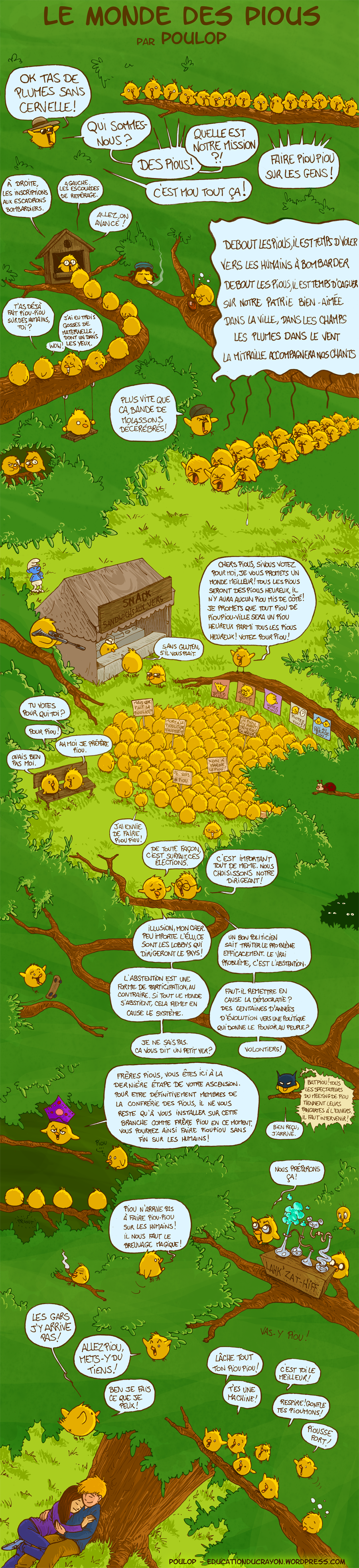 « Ô grand Poulop, Pour te défaire de la terrible malédiction des Pious qui vient de s’abattre sur toi, tu devras poster sur ta page Facebook – Oui, c’est une voix céleste qui vit avec son temps – un dessin représentant un poussin. Les vils internautes cliqueront sur « j’aime » d’un geste haineux et sans scrupule, et tu devras alors réaliser un dessin totalisant autant de poussins que de « j’aime » cliqués ! »