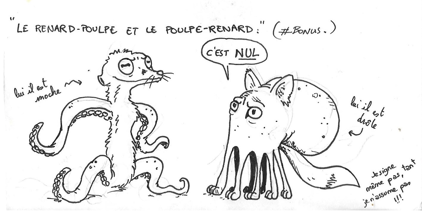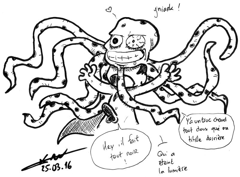 Et bien soit, tant pis pour moi ! En attendant de pouvoir un jour avoir l’honneur de vous rencontrer, je vais m’exercer jusqu’à pouvoir dessiner un poulpe avec mes pieds o/ !
