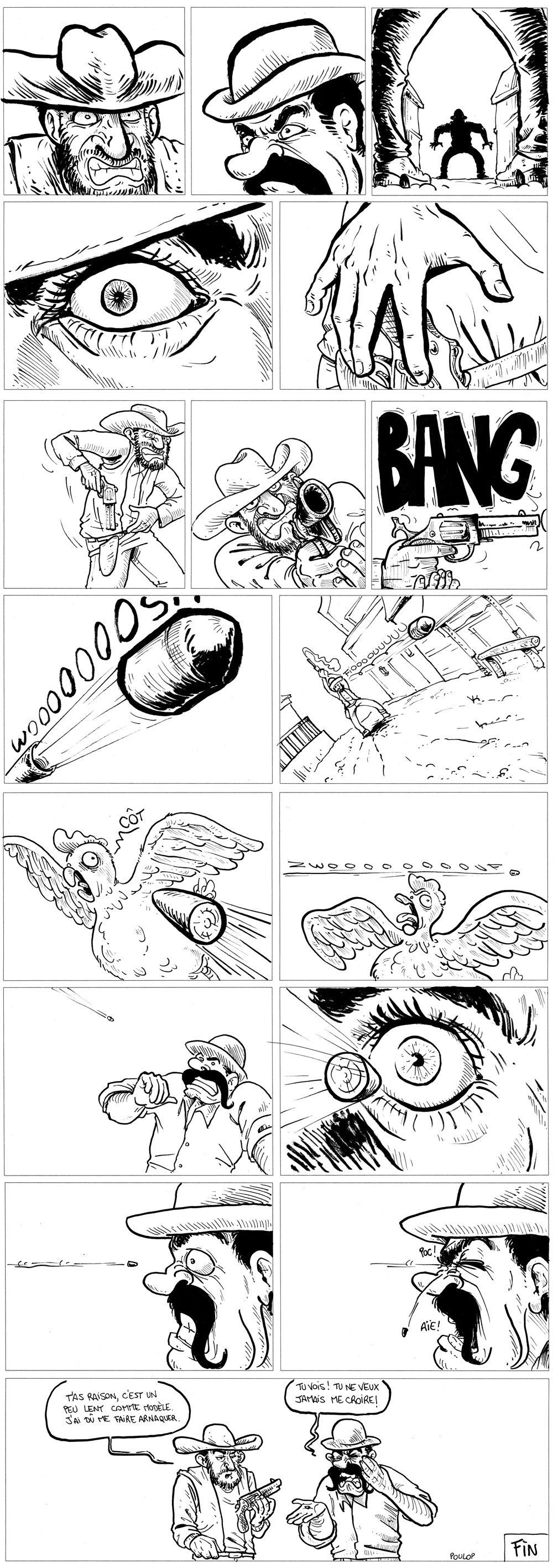 Alors que j’étais assis dans le train, prêt à revenir dans le pays du vin, des cannelés et des chocolatines, une idée m’a soudain traversé l’esprit. Une nouvelle idée basée sur le thème du Western. À croire que ces 23hBD m’avaient complètement lavé le cerveau. Du coup, regardant l’heure, je me suis lancé un petit challenge : réaliser cette idée en 2h30 avant d’arriver, le tout en 4 pages. Les voici.