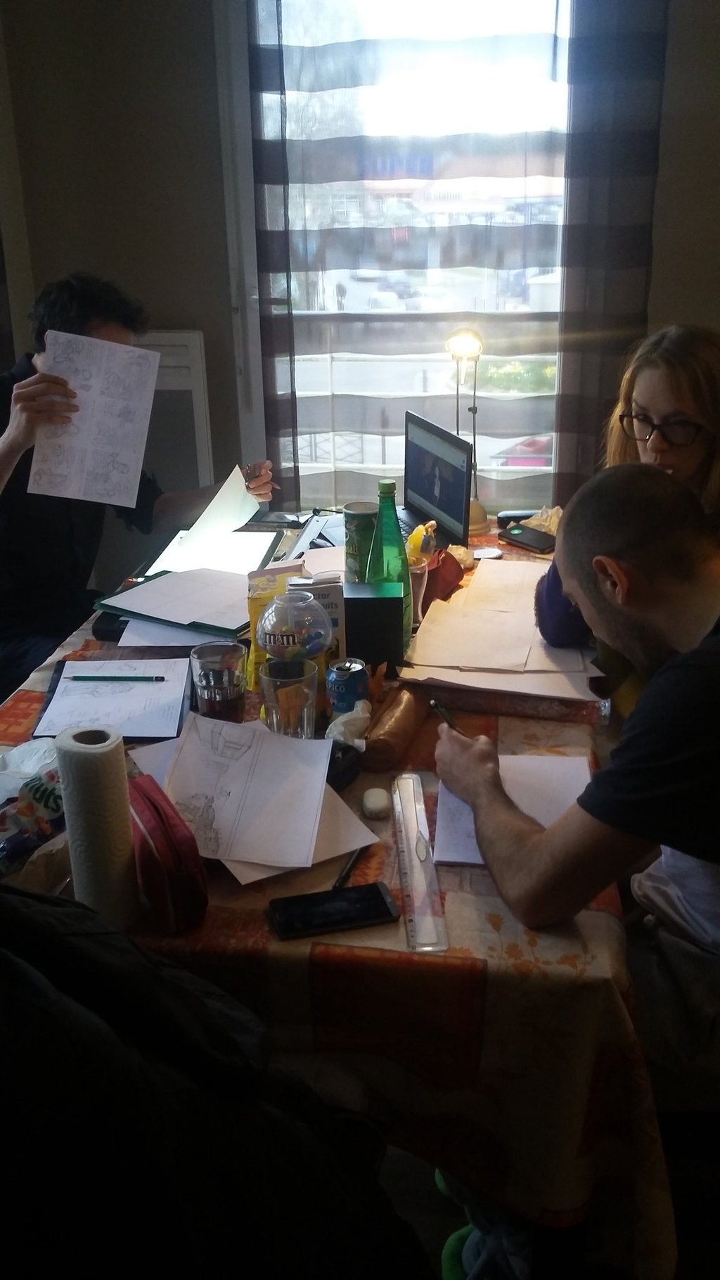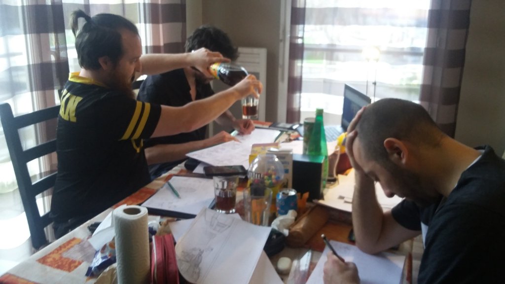 C’est alors le moment de se lancer dans le gribouillage. En parallèle, nous avons déjà engouffré trois pizzas, un paquet de chips, un sachet de cacahuètes (grillées à sec, s’il vous plaît) et deux flammekueches. Notre sang a été remplacé par diverses boissons énergisantes et, pour ma part, une perfusion au café. Du Nespresso.