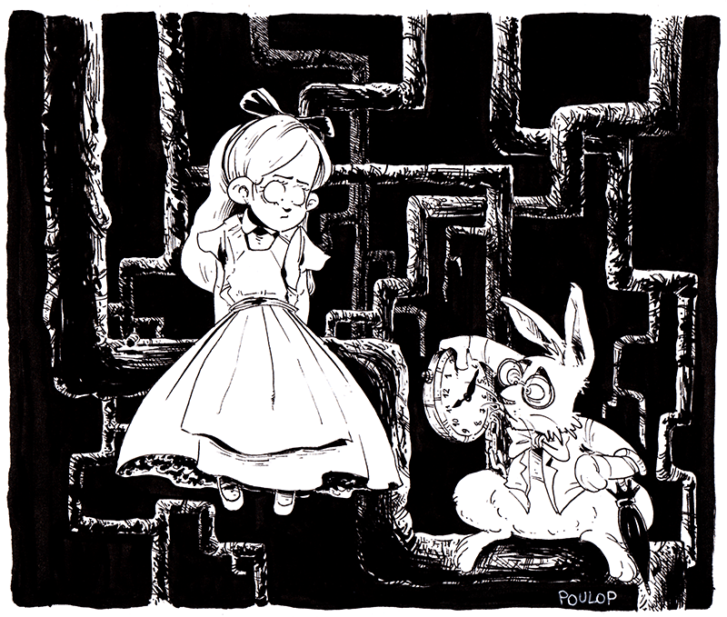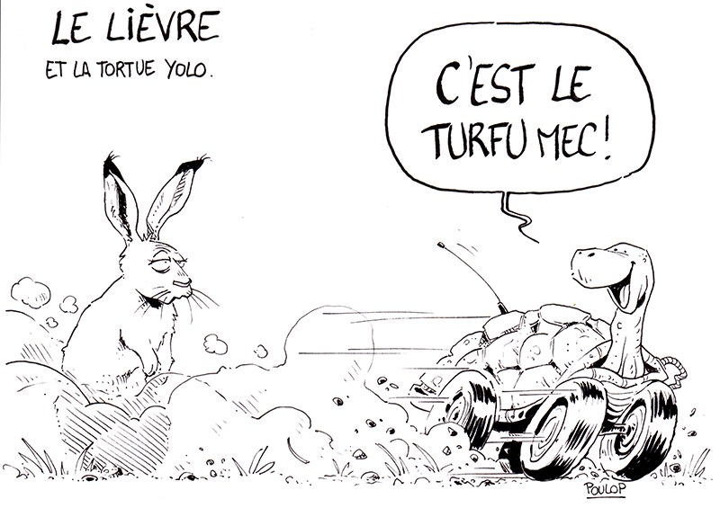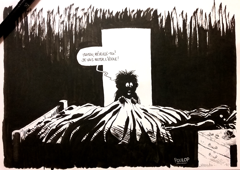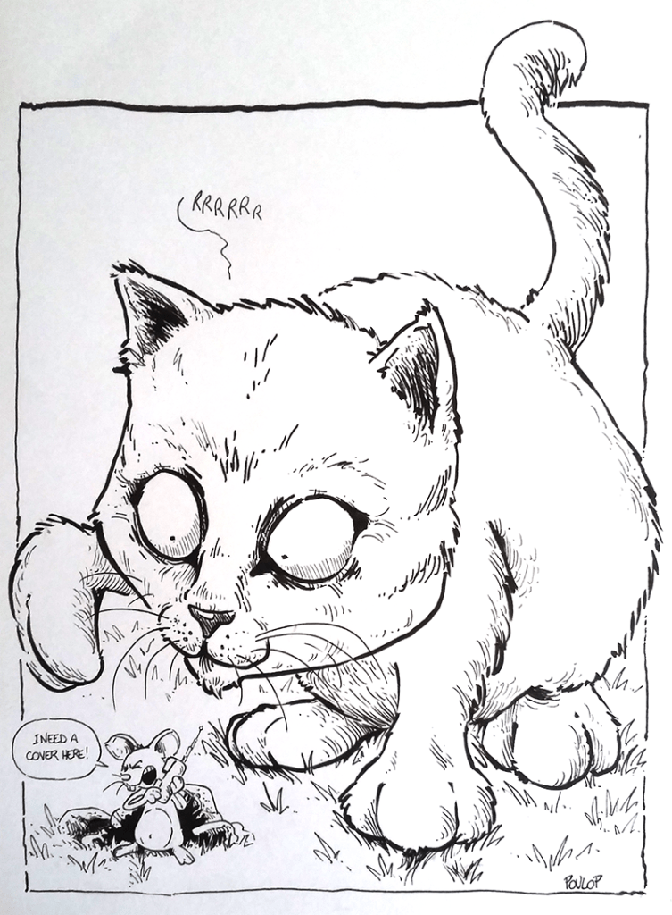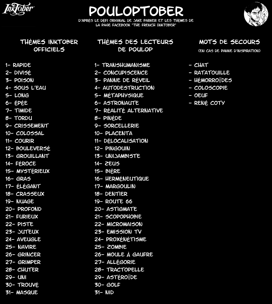 Ici, nous participons également. Aux thèmes officiels, j’ajoute les thèmes que mes lecteurs à l’esprit toujours aussi peu sain m’ont gentiment proposés sur ma page Facebook. Ce qui fait un dessin par jour devant condenser deux thèmes à chaque fois. En voici la liste.