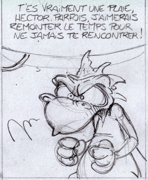 Il se trouve simplement que lorsqu’un dessin, une case voire une planche de BD ne me plaît pas, eh bien je la recommence totalement. C’est exactement ce qu’il vient de se produire pour Hector et Bulle : la page 3 ne plaisait pas, je la trouvais molle et peu entraînante.