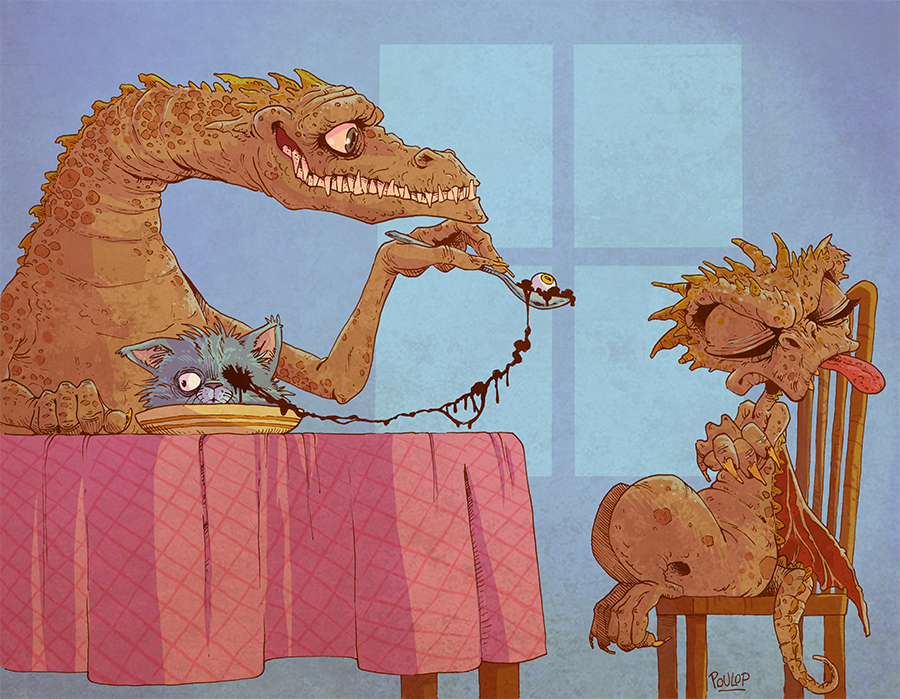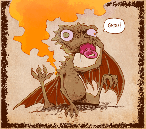Durant l’été, beaucoup sont en vacances, bande de veinards. Le blog tourne moins rapidement que d’habitude, mais ça n’empêche pas de dessiner, ma bonne dame ! Alors en vrac, voici quelques dessins et BD réalisés dans le mois en commençant tout naturellement par un bébé dragon.