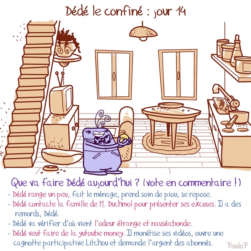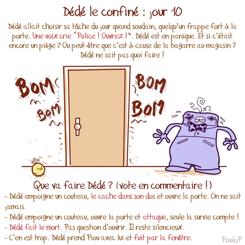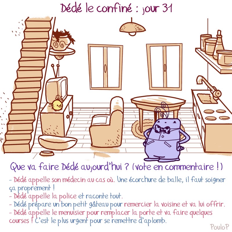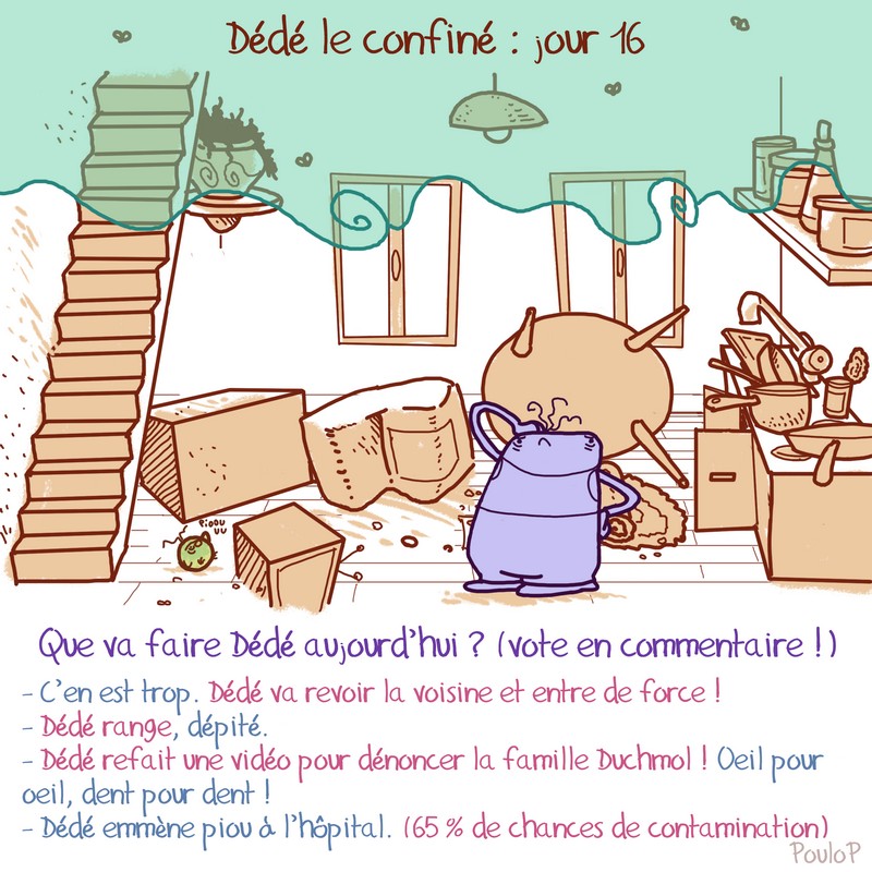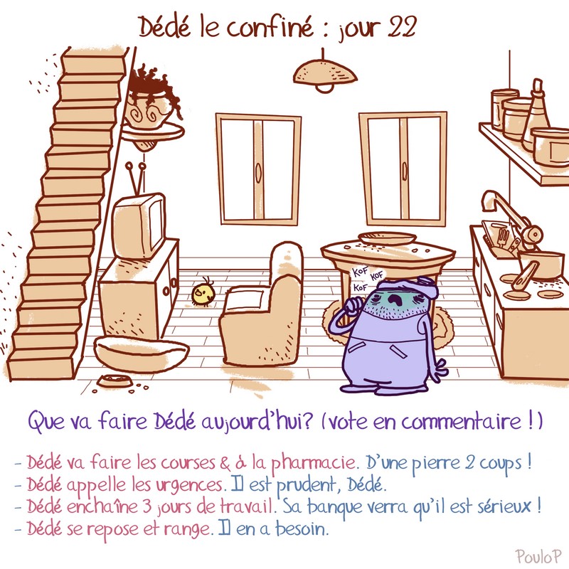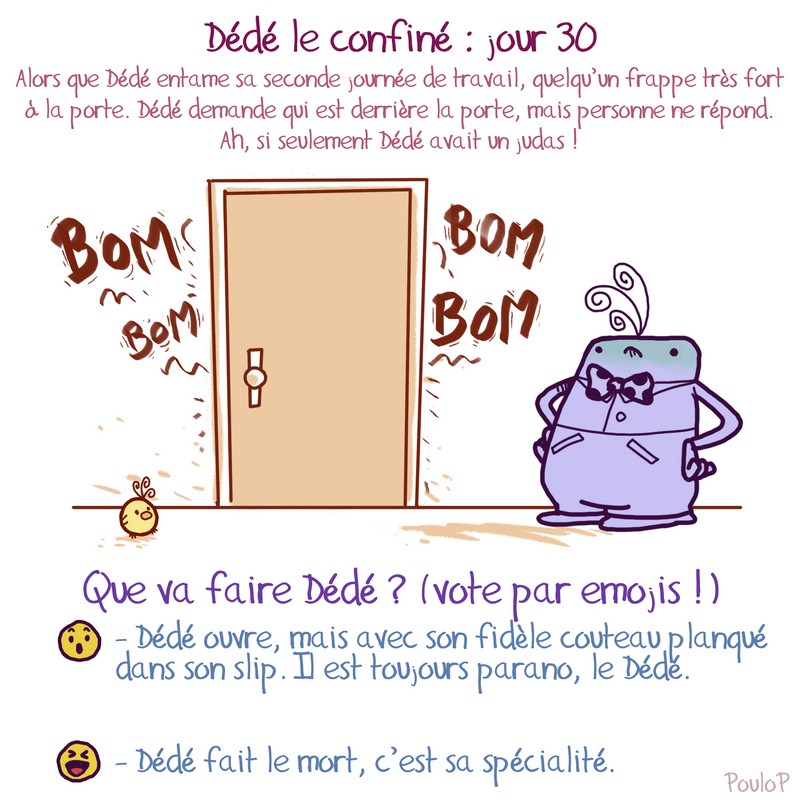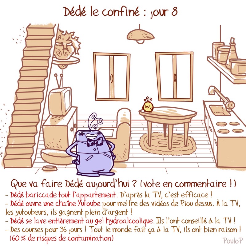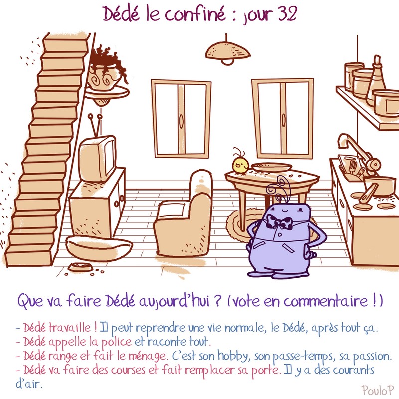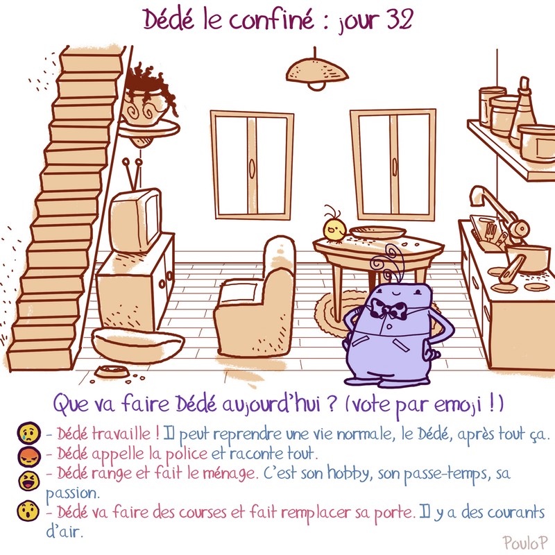 En mars 2020, toute la France est confinée à cause du coronavirus. Toute ? Oui ! Et pour divertir la populace qui ne demande qu’à s’occuper l’esprit, Poulop crée une aventure interactive de 32 jours pendant laquelle, chaque jour, les lecteurs et lectrices vont pouvoir voter pour choisir la suite de l’aventure de Dédé.