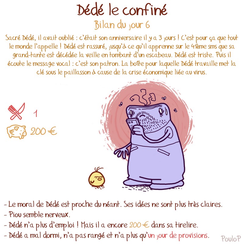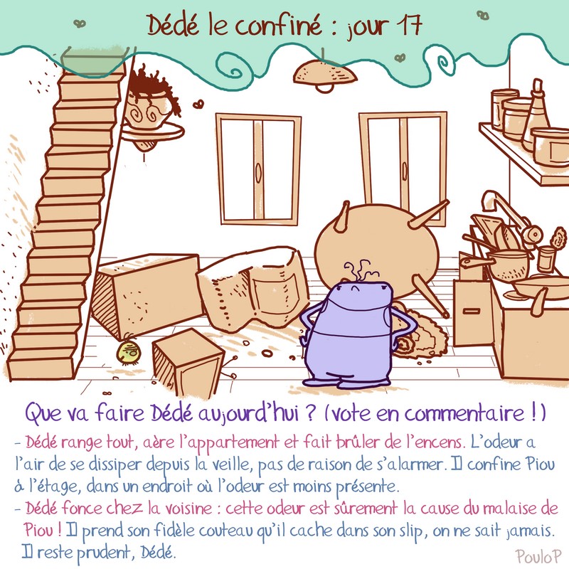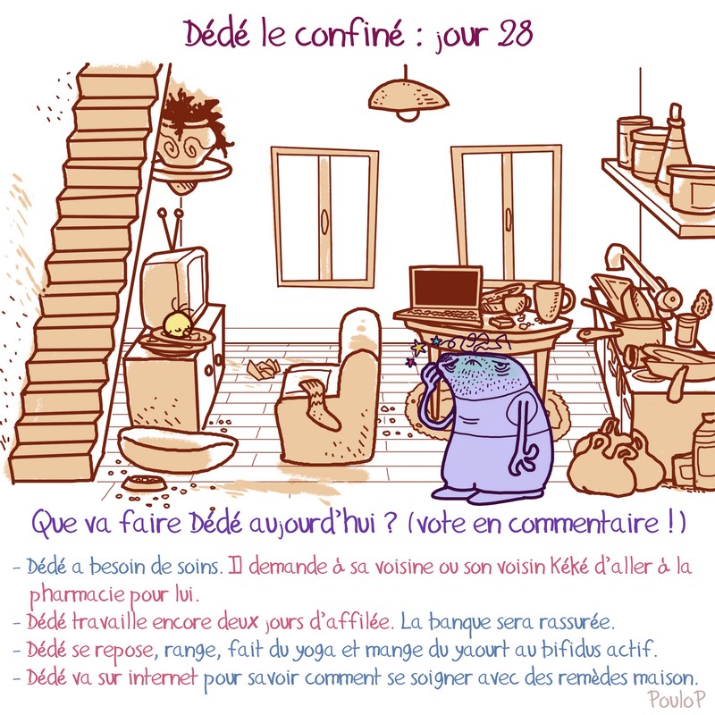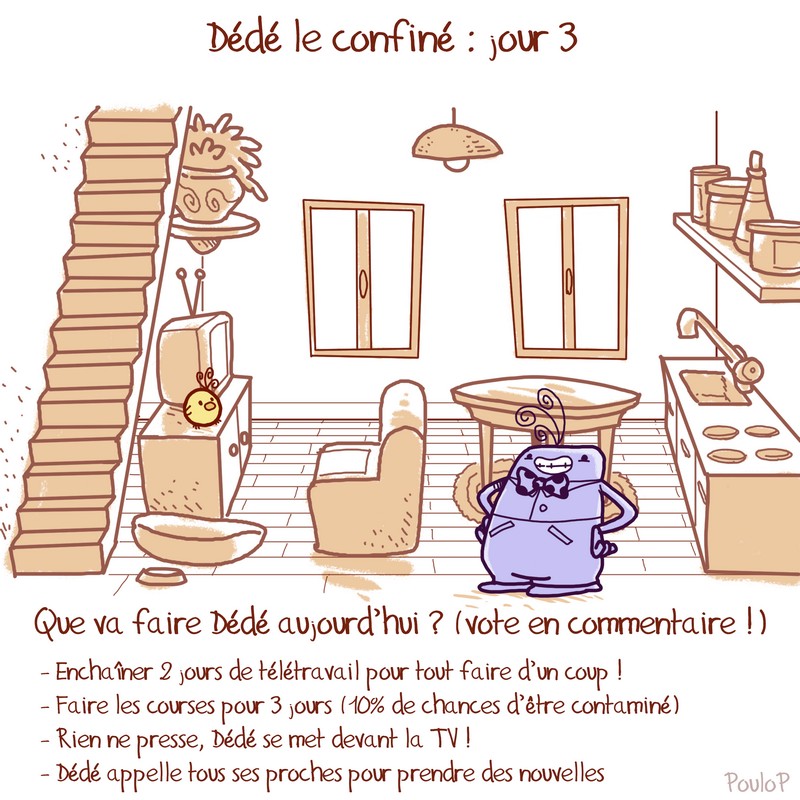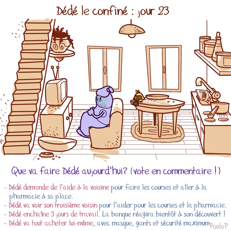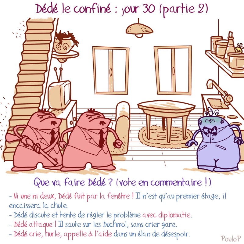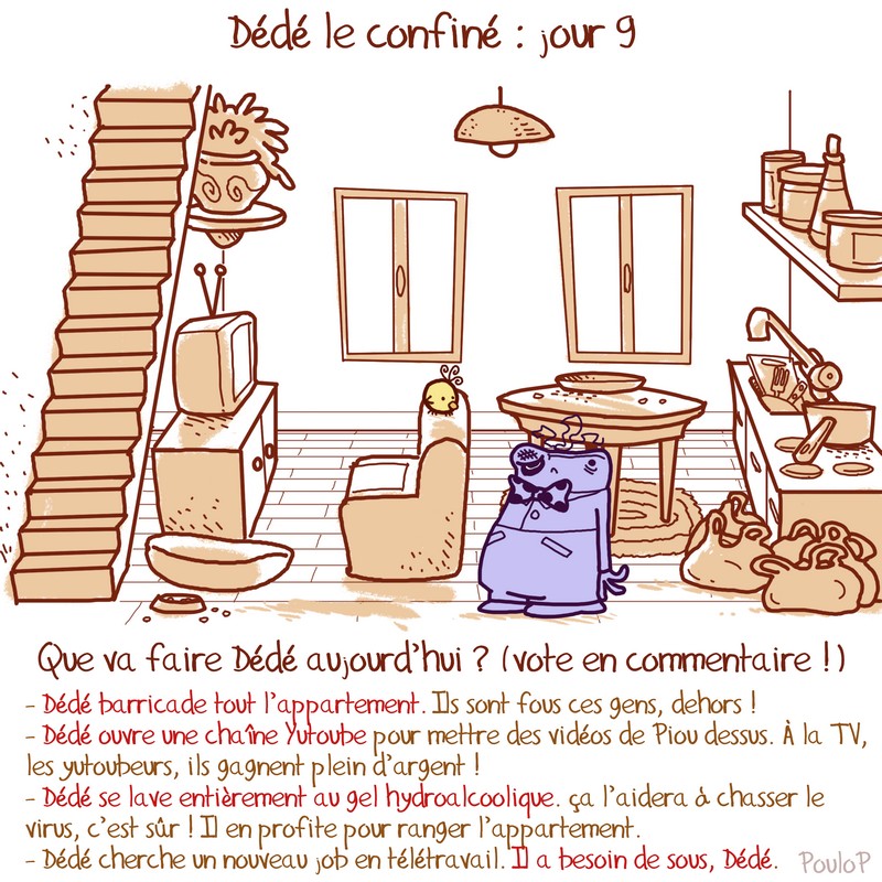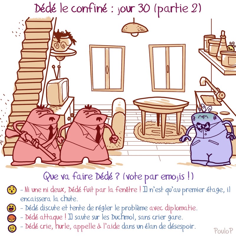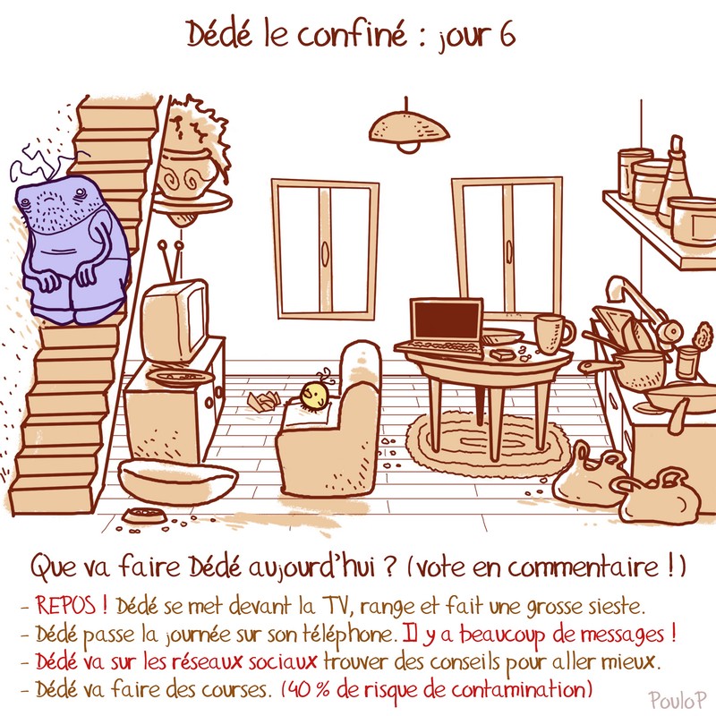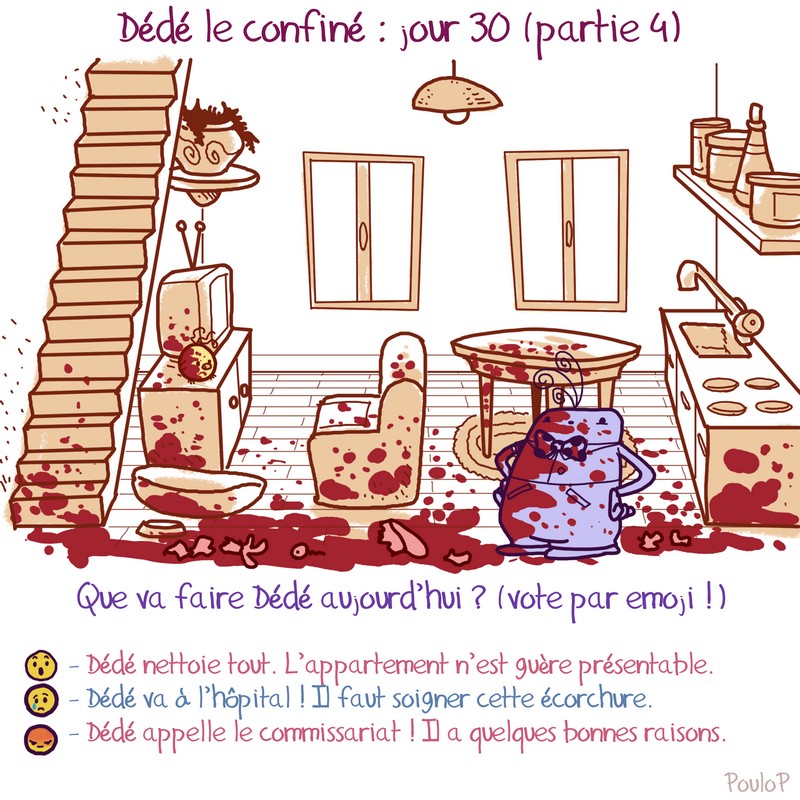 En mars 2020, toute la France est confinée à cause du coronavirus. Toute ? Oui ! Et pour divertir la populace qui ne demande qu’à s’occuper l’esprit, Poulop crée une aventure interactive de 32 jours pendant laquelle, chaque jour, les lecteurs et lectrices vont pouvoir voter pour choisir la suite de l’aventure de Dédé.