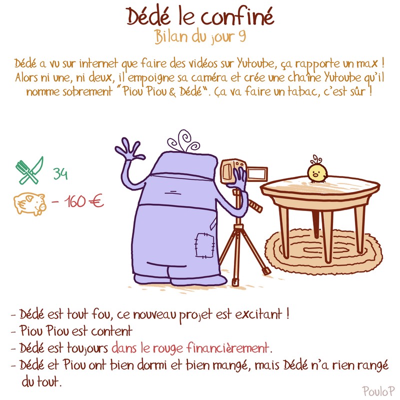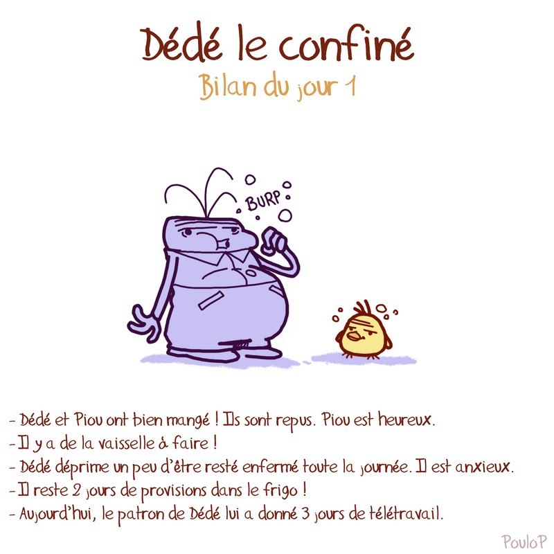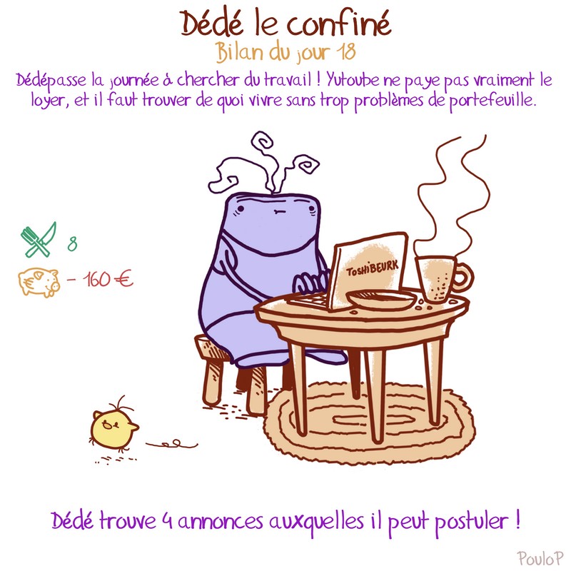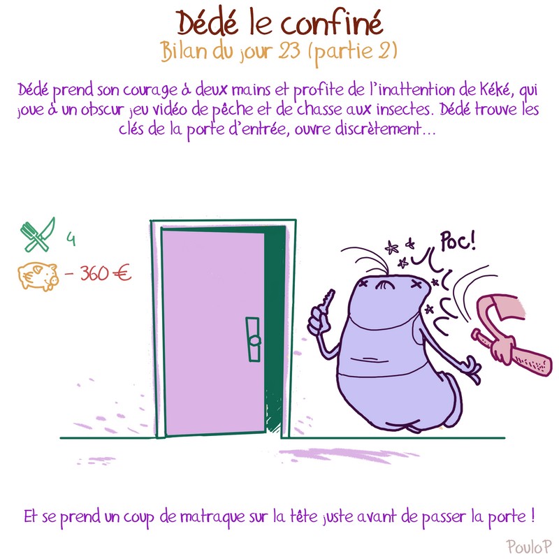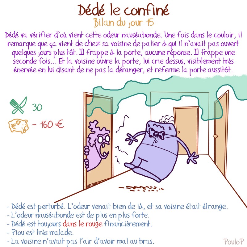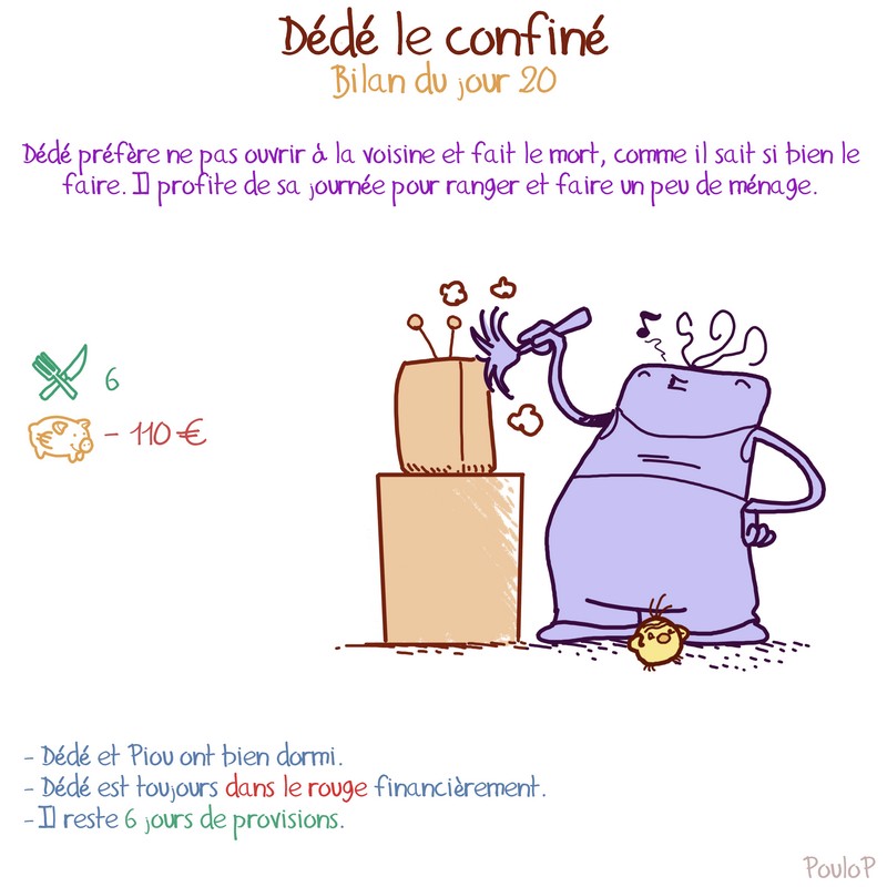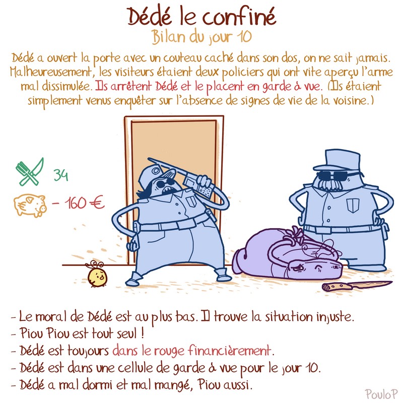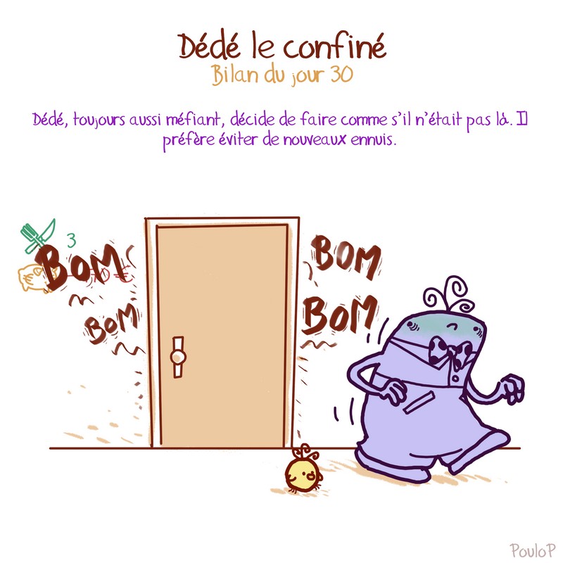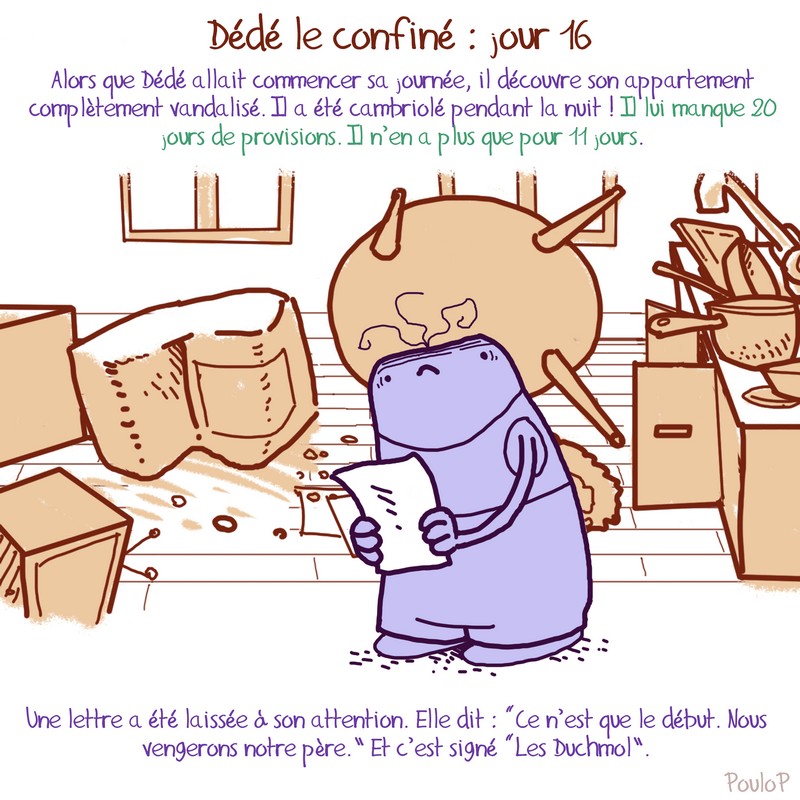 En mars 2020, toute la France est confinée à cause du coronavirus. Toute ? Oui ! Et pour divertir la populace qui ne demande qu’à s’occuper l’esprit, Poulop crée une aventure interactive de 32 jours pendant laquelle, chaque jour, les lecteurs et lectrices vont pouvoir voter pour choisir la suite de l’aventure de Dédé.
