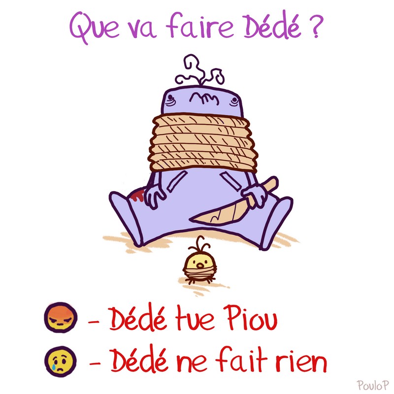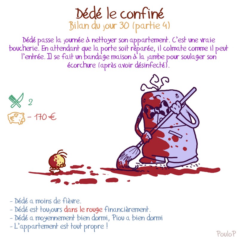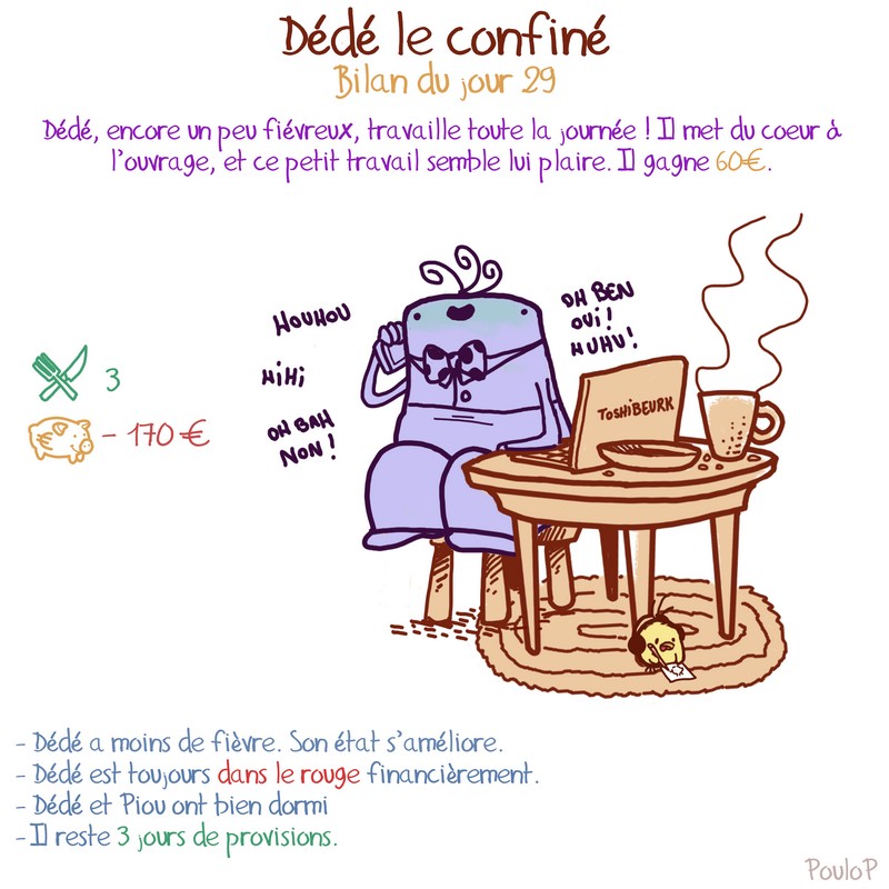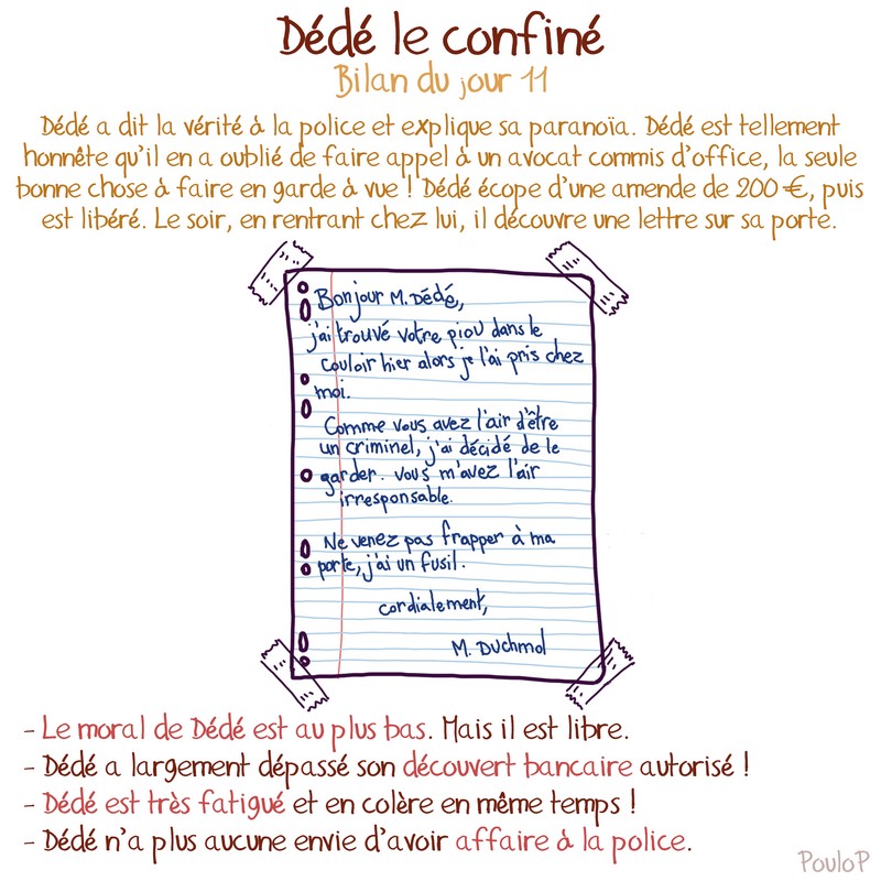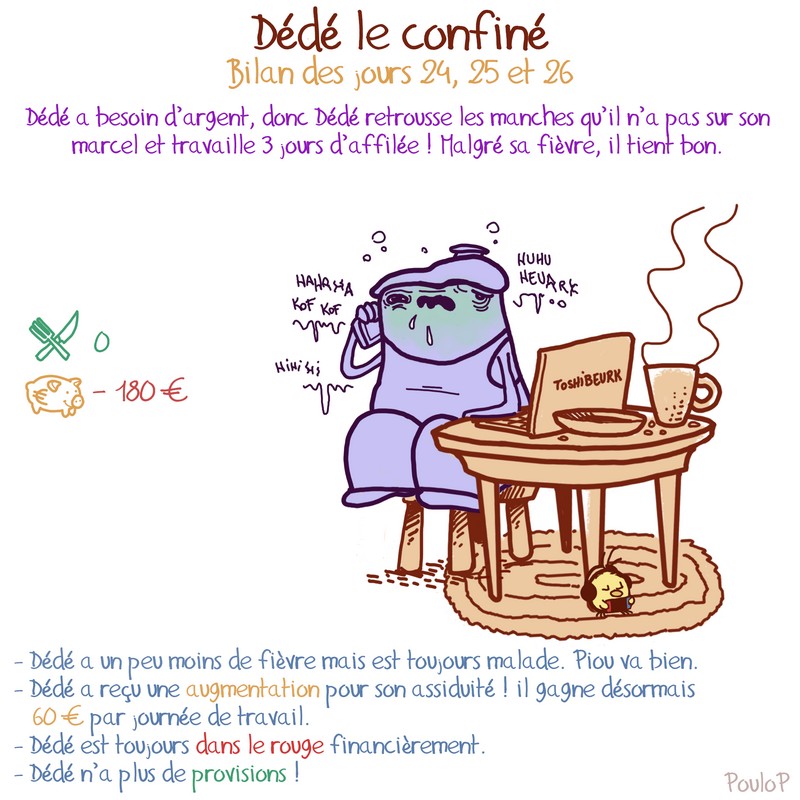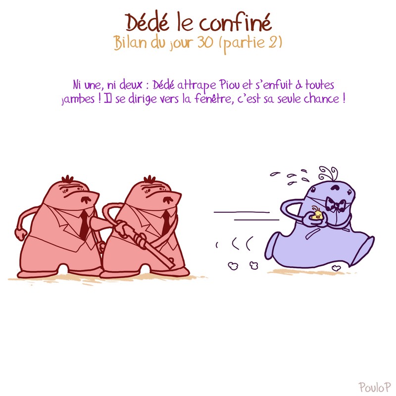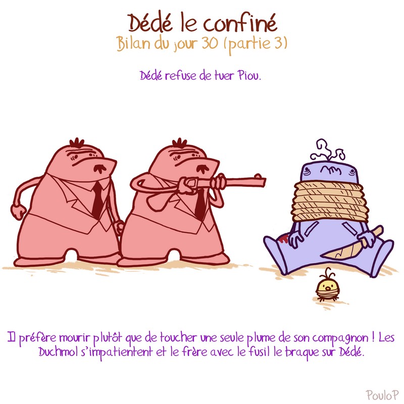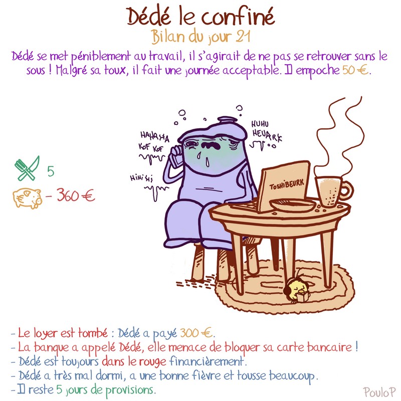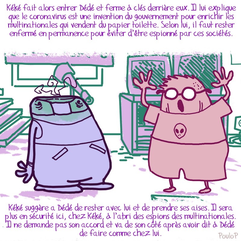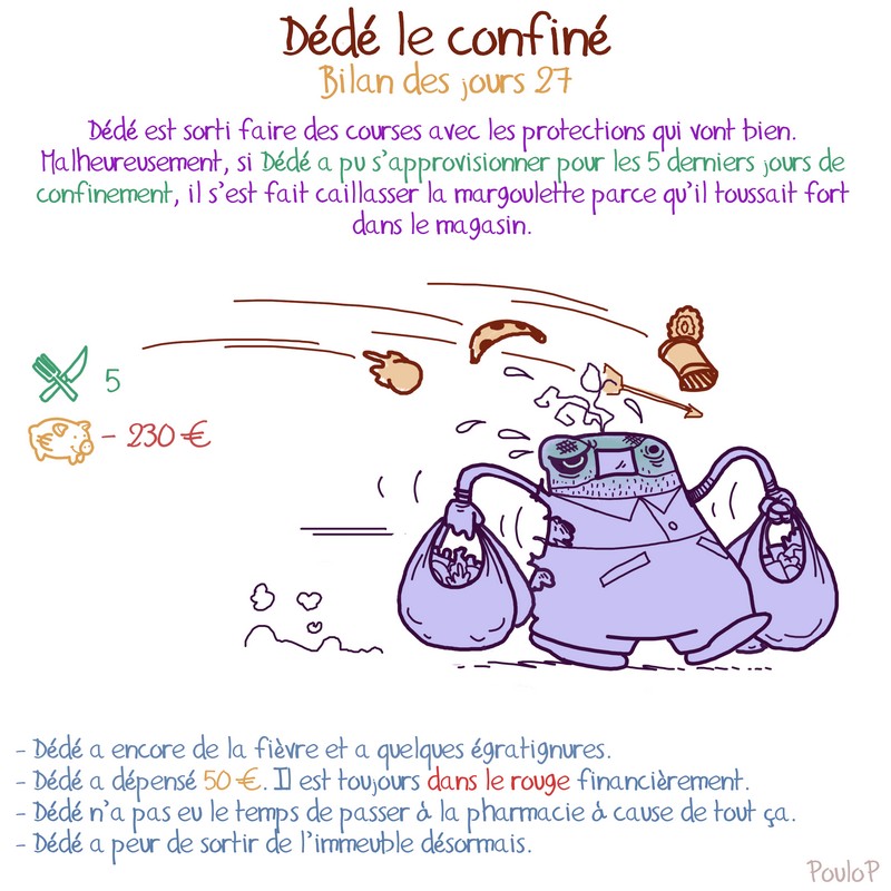 En mars 2020, toute la France est confinée à cause du coronavirus. Toute ? Oui ! Et pour divertir la populace qui ne demande qu’à s’occuper l’esprit, Poulop crée une aventure interactive de 32 jours pendant laquelle, chaque jour, les lecteurs et lectrices vont pouvoir voter pour choisir la suite de l’aventure de Dédé.