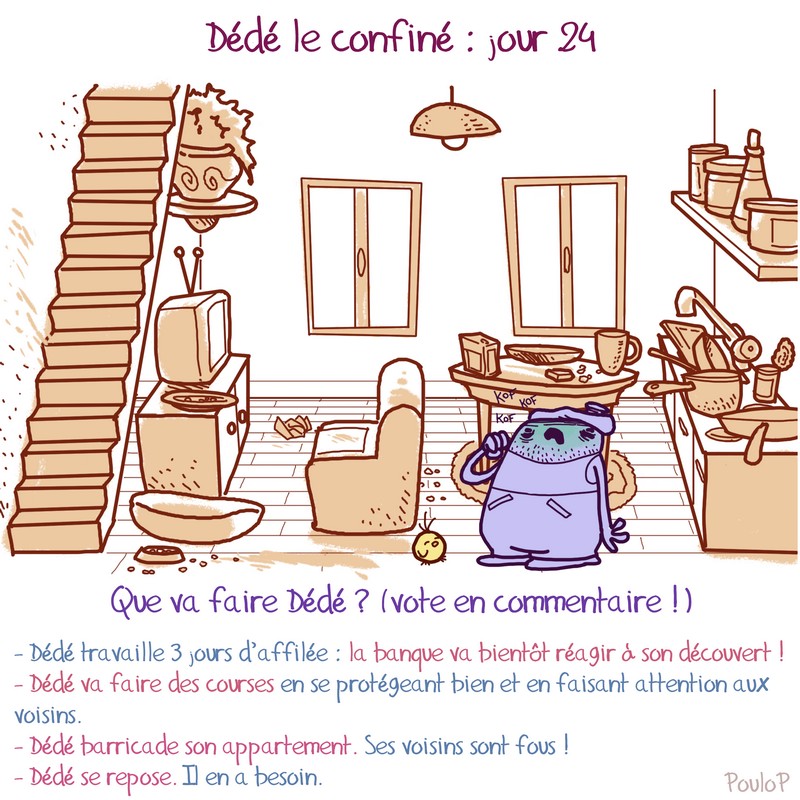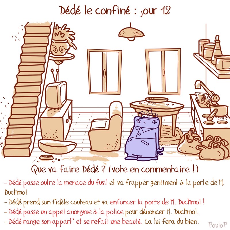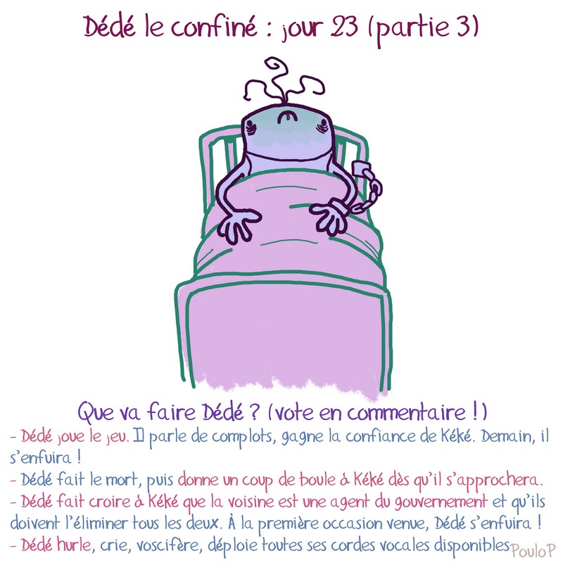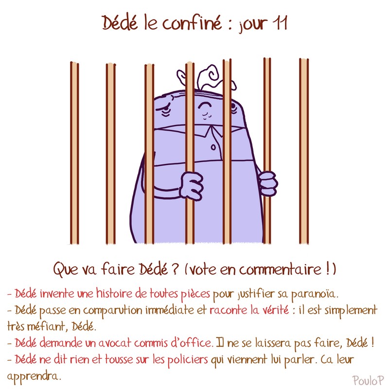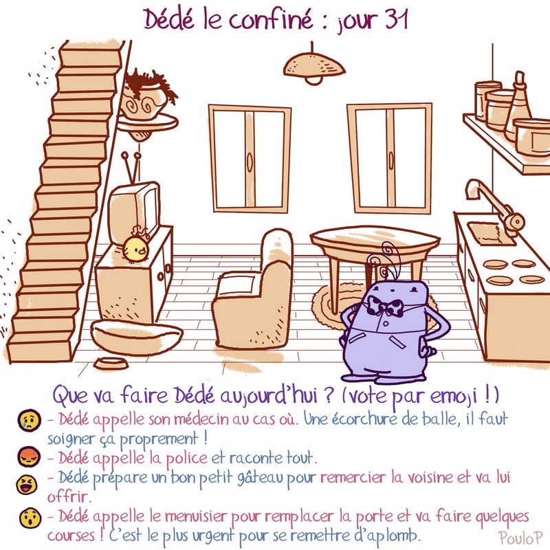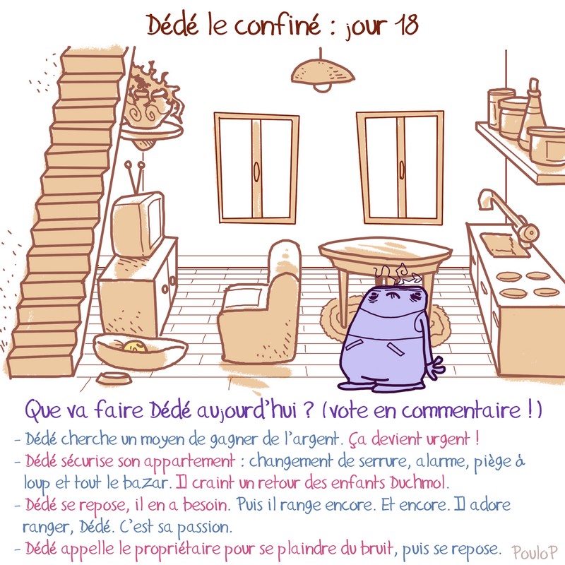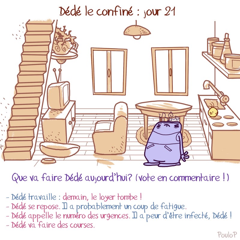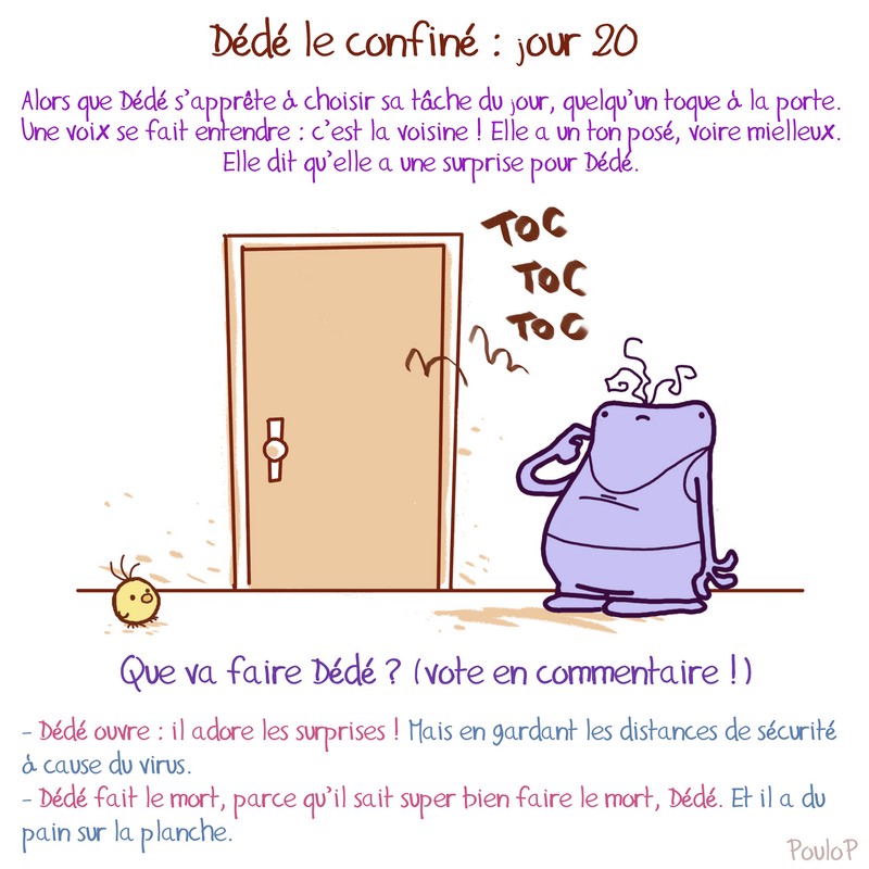 En mars 2020, toute la France est confinée à cause du coronavirus. Toute ? Oui ! Et pour divertir la populace qui ne demande qu’à s’occuper l’esprit, Poulop crée une aventure interactive de 32 jours pendant laquelle, chaque jour, les lecteurs et lectrices vont pouvoir voter pour choisir la suite de l’aventure de Dédé.