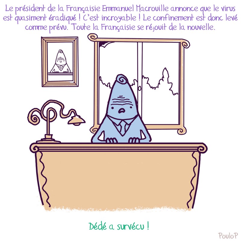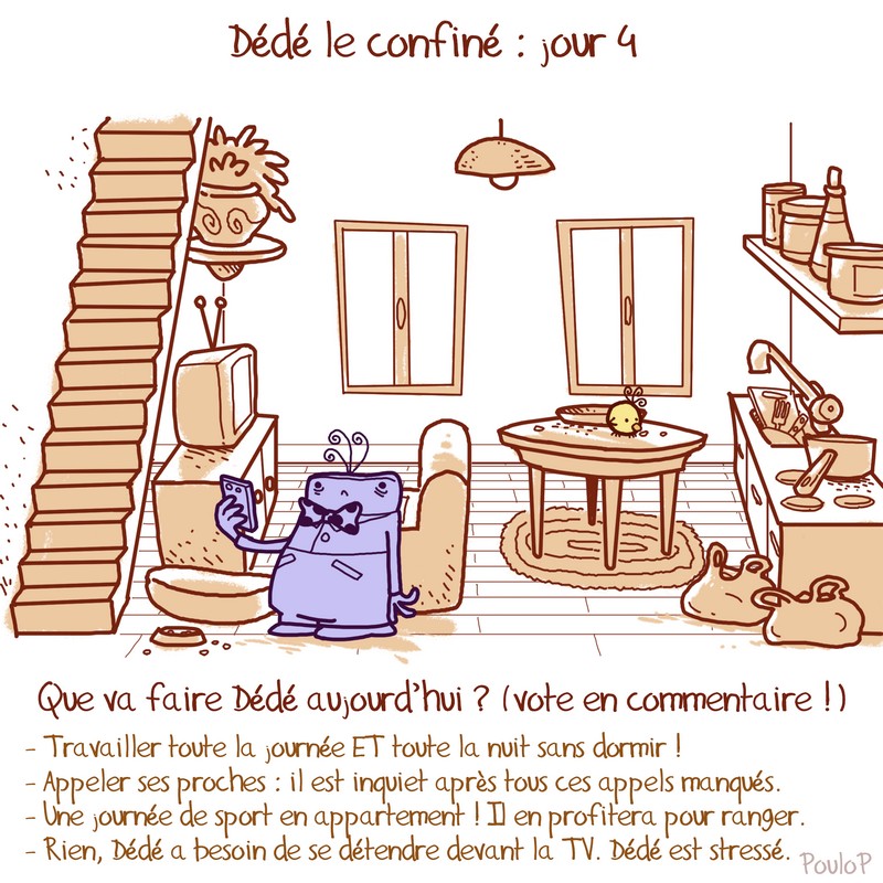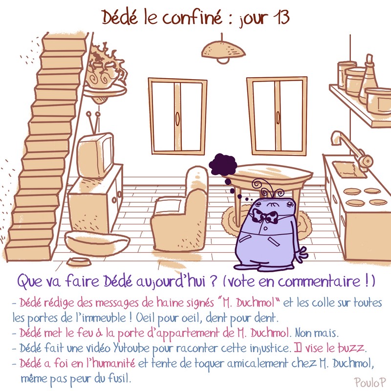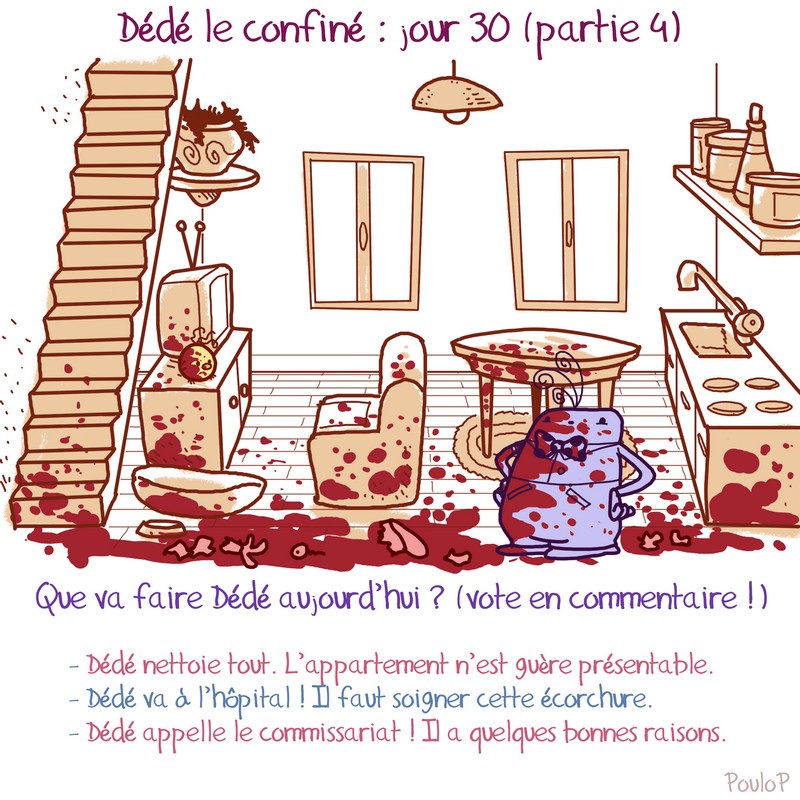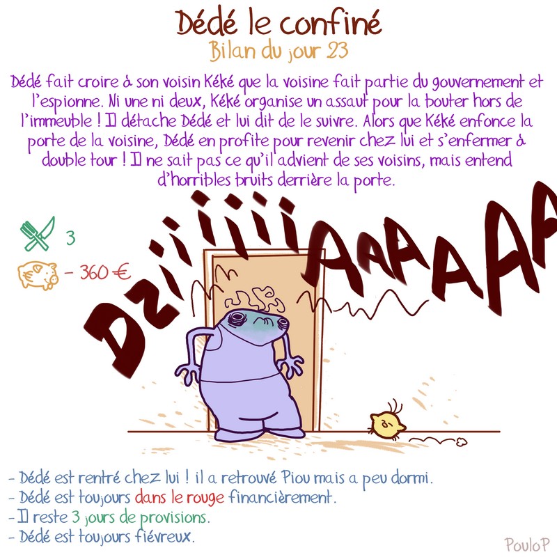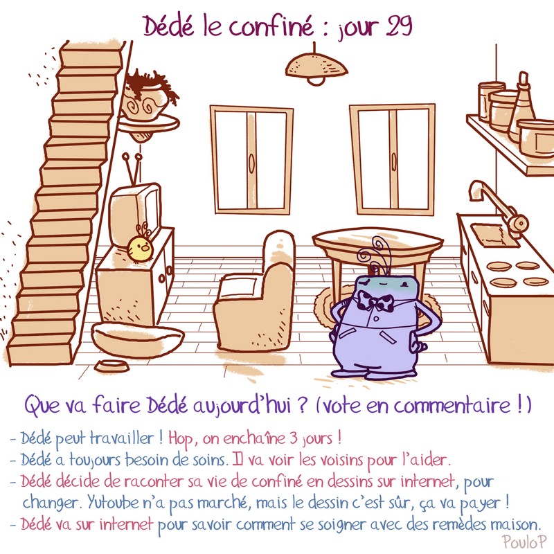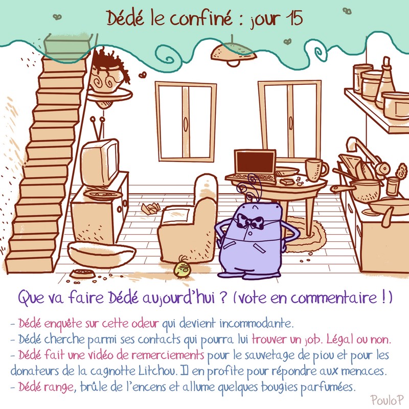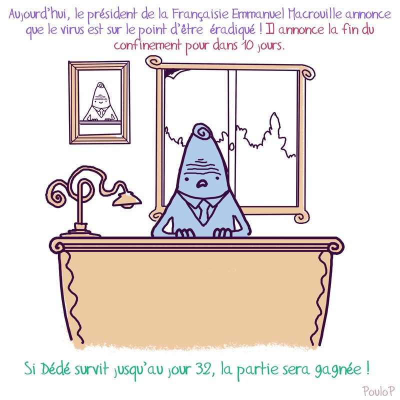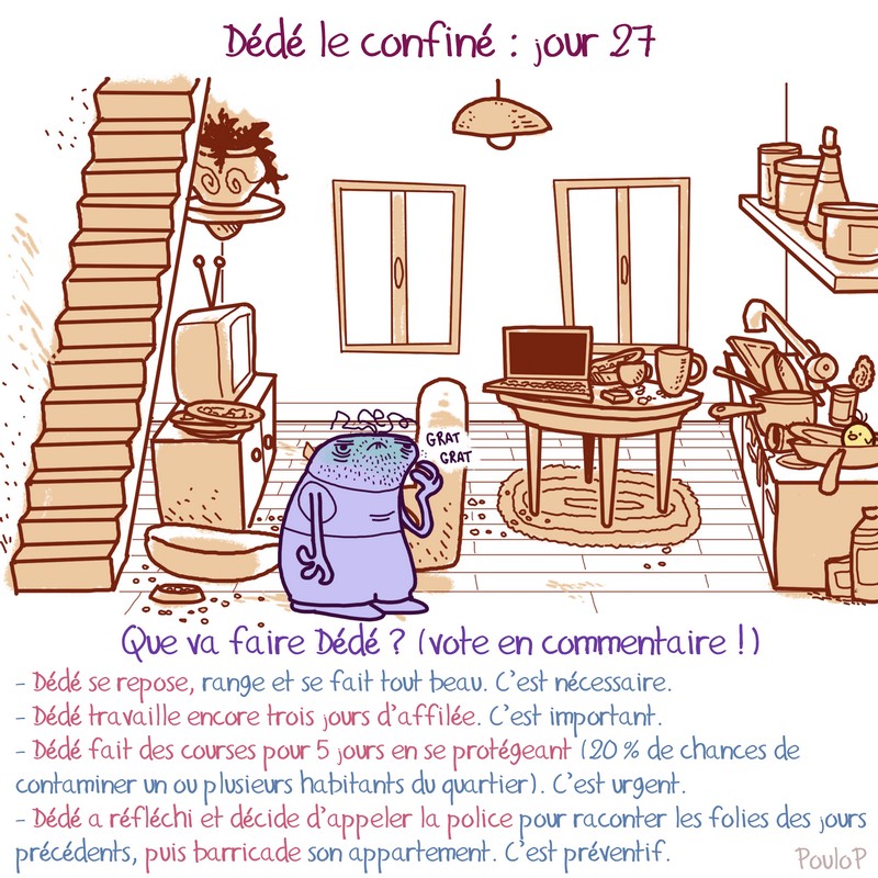 En mars 2020, toute la France est confinée à cause du coronavirus. Toute ? Oui ! Et pour divertir la populace qui ne demande qu’à s’occuper l’esprit, Poulop crée une aventure interactive de 32 jours pendant laquelle, chaque jour, les lecteurs et lectrices vont pouvoir voter pour choisir la suite de l’aventure de Dédé.