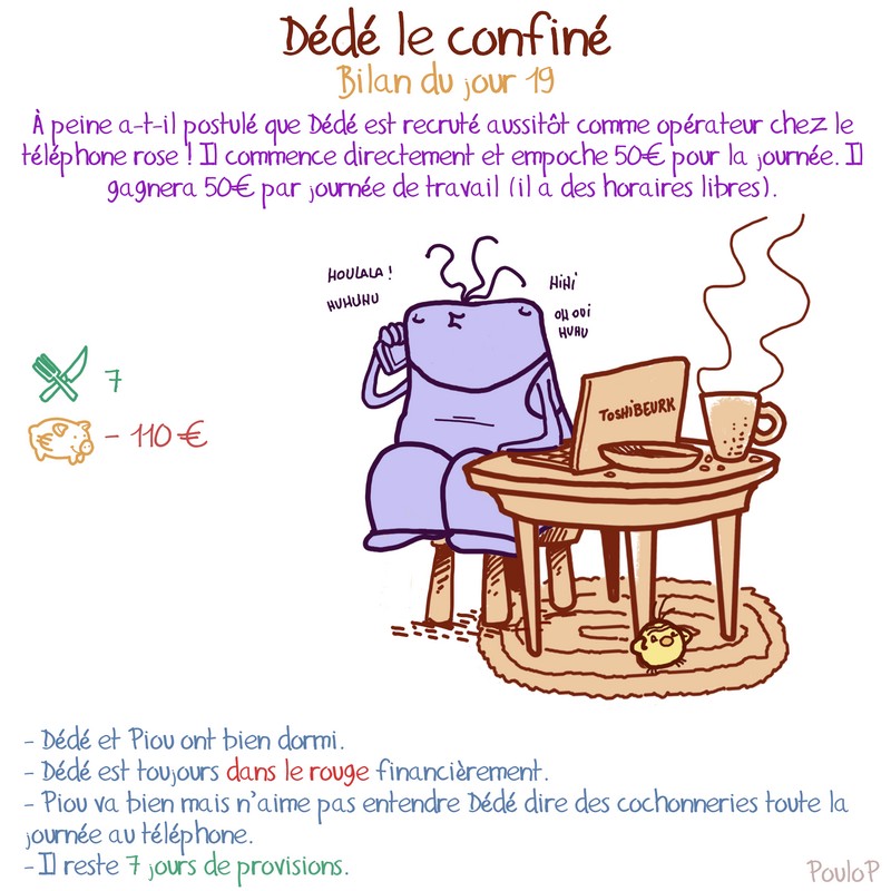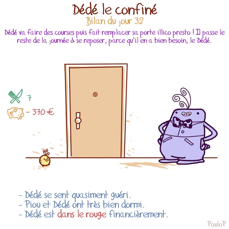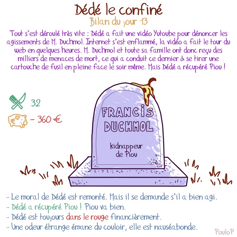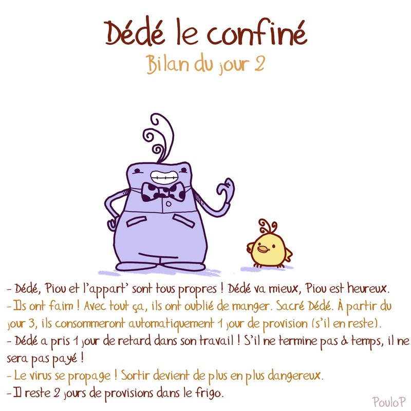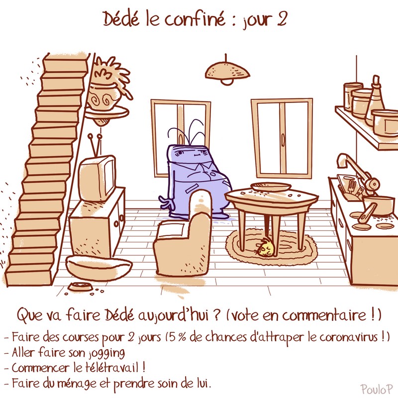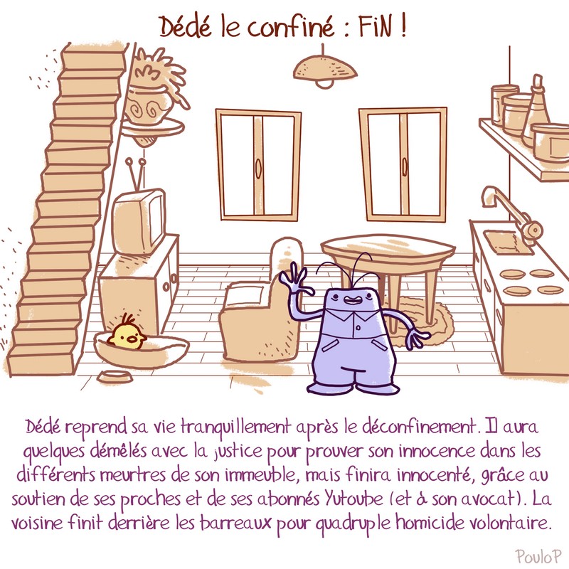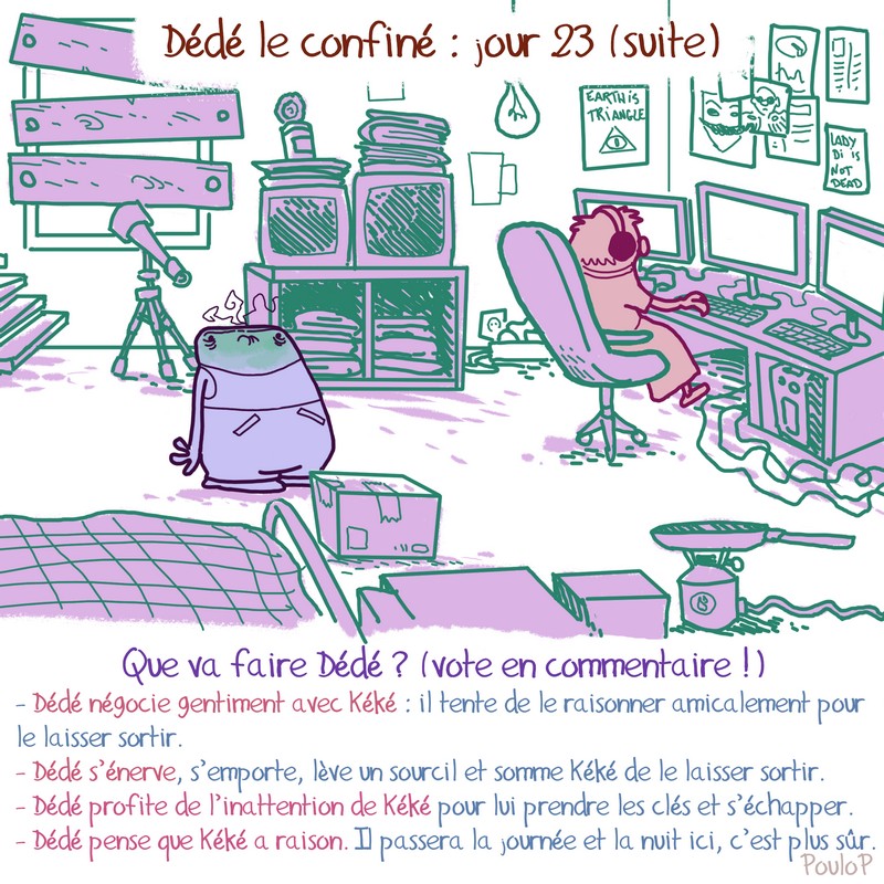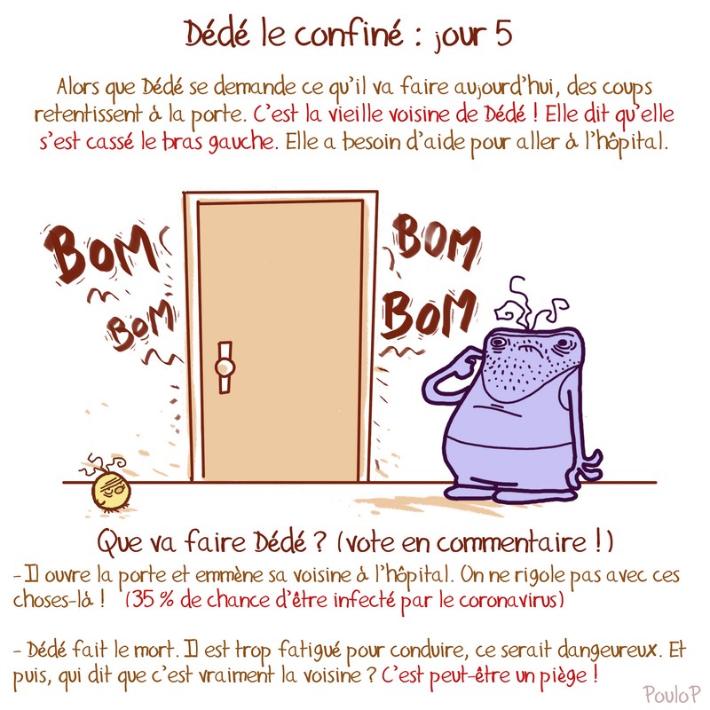 En mars 2020, toute la France est confinée à cause du coronavirus. Toute ? Oui ! Et pour divertir la populace qui ne demande qu’à s’occuper l’esprit, Poulop crée une aventure interactive de 32 jours pendant laquelle, chaque jour, les lecteurs et lectrices vont pouvoir voter pour choisir la suite de l’aventure de Dédé.