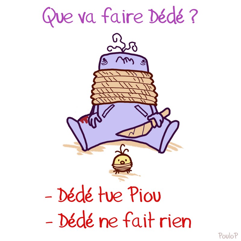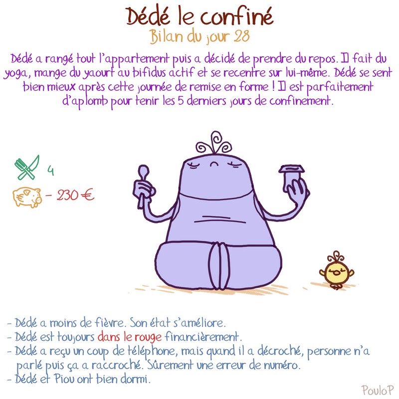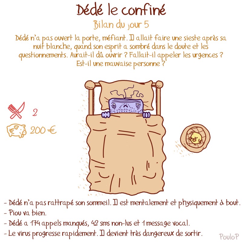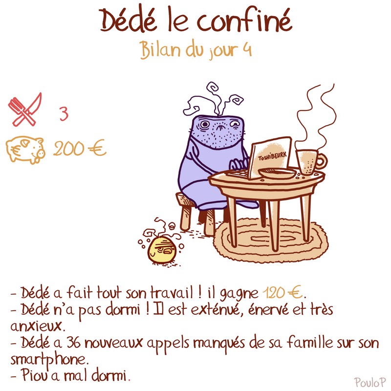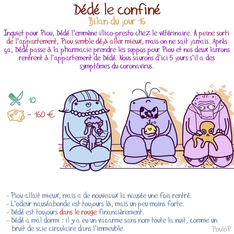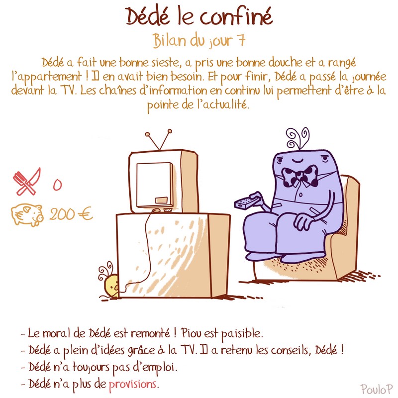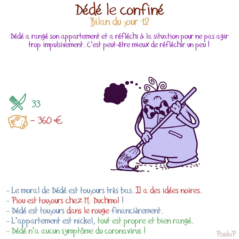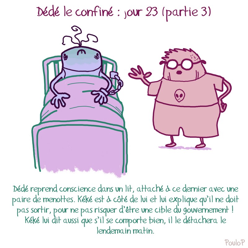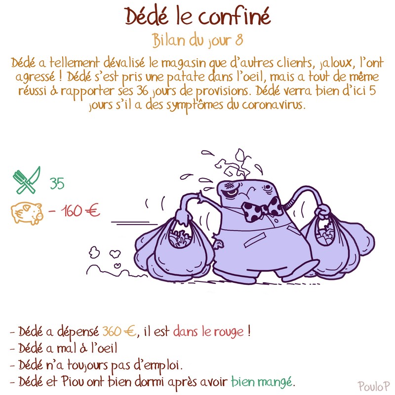 En mars 2020, toute la France est confinée à cause du coronavirus. Toute ? Oui ! Et pour divertir la populace qui ne demande qu’à s’occuper l’esprit, Poulop crée une aventure interactive de 32 jours pendant laquelle, chaque jour, les lecteurs et lectrices vont pouvoir voter pour choisir la suite de l’aventure de Dédé.